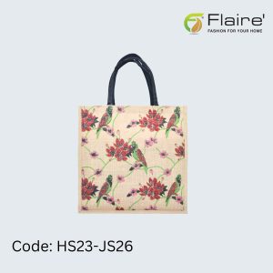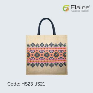Crafted from durable jute, this bag features a spacious 16x16x5 design, sturdy polyester webbing handles with rope detailing, and a front side adorned with eye-catching screen-printed designs. Its combination of style, functionality, and sustainability makes it the ideal choice for eco-conscious shoppers.